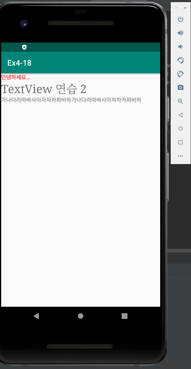 package kr.ac.dongyang.ex4_18 import android.graphics.Color import android.graphics.Typeface import androidx.appcompat.app.AppCompatActivity import android.os.Bundle import kotlinx.android.synthetic.main.activity_main.* class MainActivity : AppCompatActivity() { override fun onCreate(savedInstanceState: Bundle?) { super.onCreate(savedInstanceState) setContentView(R.layout.activity_main) textView1.setText("안녕하세요...") textView1.setTextColor(Color.RED) // 컬러지정 textView2.setTextSize(30.0f) //size 지정 textView2.setTypeface(Typeface.SERIF) // 글꼴지정 textView3.setText("가나다라마바사아자차카파바하가나다라마바사아자차카파바하") // text 지정 textView3.setSingleLine() } }실행결과