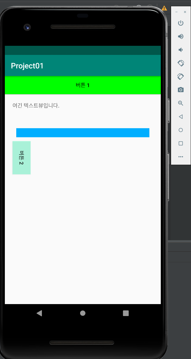 <?xml version="1.0" encoding="utf-8"?> <LinearLayout xmlns:android="http://schemas.android.com/apk/res/android" xmlns:app="http://schemas.android.com/apk/res-auto" xmlns:tools="http://schemas.android.com/tools" android:layout_width="match_parent" android:layout_height="match_parent" android:orientation="vertical" tools:context=".MainActivity"> <Button android:layout_width="match_parent" android:layout_height="wrap_content" android:background="#00ff00" android:text="버튼 1"/> <TextView android:layout_width="match_parent" android:layout_height="wrap_content" android:layout_margin="20dp" android:text="여긴 텍스트뷰입니다. "/> <EditText android:layout_width="match_parent" android:layout_height="wrap_content" android:layout_margin="30dp" android:background="#00AEFF" /> <Button android:layout_width="wrap_content" android:layout_height="wrap_content" android:background="#4800FFA6" android:rotation="90" android:text="버튼 2" /> </LinearLayout>실행결과