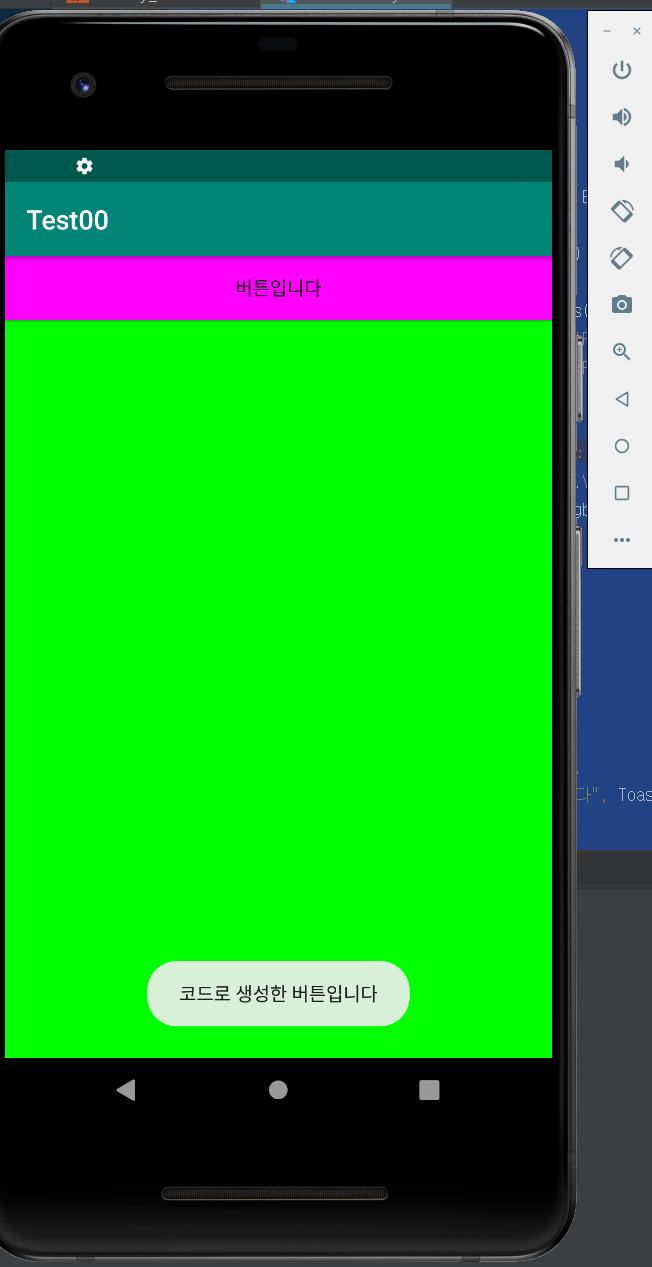 package kr.ac.dongyang.test00 import android.graphics.Color import androidx.appcompat.app.AppCompatActivity import android.os.Bundle import android.widget.Button import android.widget.LinearLayout import android.widget.Toast class MainActivity : AppCompatActivity() { override fun onCreate(savedInstanceState: Bundle?) { super.onCreate(savedInstanceState) setContentView(R.layout.activity_main) val params = LinearLayout.LayoutParams( LinearLayout.LayoutParams.MATCH_PARENT, LinearLayout.LayoutParams.MATCH_PARENT ) val baseLayout = LinearLayout(this) baseLayout.orientation = LinearLayout.VERTICAL baseLayout.setBackgroundColor(Color.rgb(0,255,0)) setContentView(baseLayout,params) var btn = Button(this) btn.text = "버튼입니다" btn.setBackgroundColor(Color.MAGENTA) baseLayout.addView(btn) btn.setOnClickListener { Toast.makeText(applicationContext, "코드로 생성한 버튼입니다", Toast.LENGTH_SHORT).show() } } }실행결과