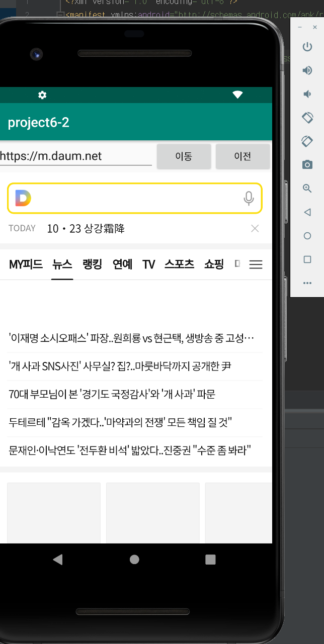 <?xml version="1.0" encoding="utf-8"?> <manifest xmlns:android="http://schemas.android.com/apk/res/android" package="kr.ac.dongyang.project6_2"> <uses-permission android:name="android.permission.INTERNET" /> //추가한부분이부분 <application android:allowBackup="true" android:icon="@mipmap/ic_launcher" //바꿔도 되지만 굳이? android:label="@string/app_name"//바꿔도 되지만 굳이? android:roundIcon="@mipmap/ic_launcher_round" android:supportsRtl="true" android:theme="@style/AppTheme"> <activity android:name=".MainActivity"> <intent-filter> <action android:name="android.intent.action.MAIN" /> <category android:name="android.intent.category.LAUNCHER" /> </intent-filter> </activity> </application> </manifest>실행결과