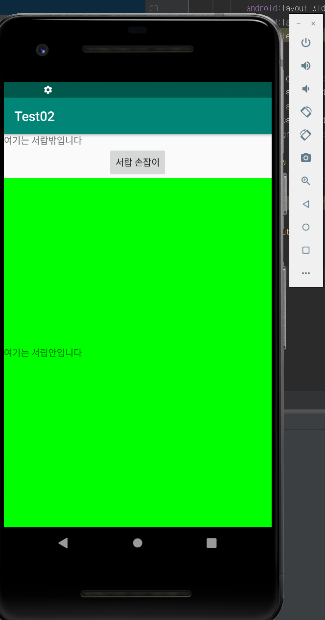 <?xml version="1.0" encoding="utf-8"?> <LinearLayout xmlns:android="http://schemas.android.com/apk/res/android" xmlns:app="http://schemas.android.com/apk/res-auto" xmlns:tools="http://schemas.android.com/tools" android:layout_width="fill_parent" android:layout_height="fill_parent" android:orientation="vertical" tools:context=".MainActivity"> <TextView android:layout_width="wrap_content" android:layout_height="wrap_content" android:text="여기는 서랍밖입니다" /> <SlidingDrawer android:layout_width="wrap_content" android:layout_height="wrap_content" android:content="@+id/content" android:handle="@+id/handle"> <Button android:id="@+id/handle" android:layout_width="wrap_content" android:layout_height="wrap_content" android:text="서랍 손잡이" /> <LinearLayout android:id="@+id/content" android:layout_width="match_parent" android:layout_height="wrap_content" android:background="#00FF00" android:gravity="center"> <TextView android:layout_width="match_parent" android:layout_height="wrap_content" android:text="여기는 서랍안입니다" /> </LinearLayout> </SlidingDrawer> </LinearLayout>실행결과