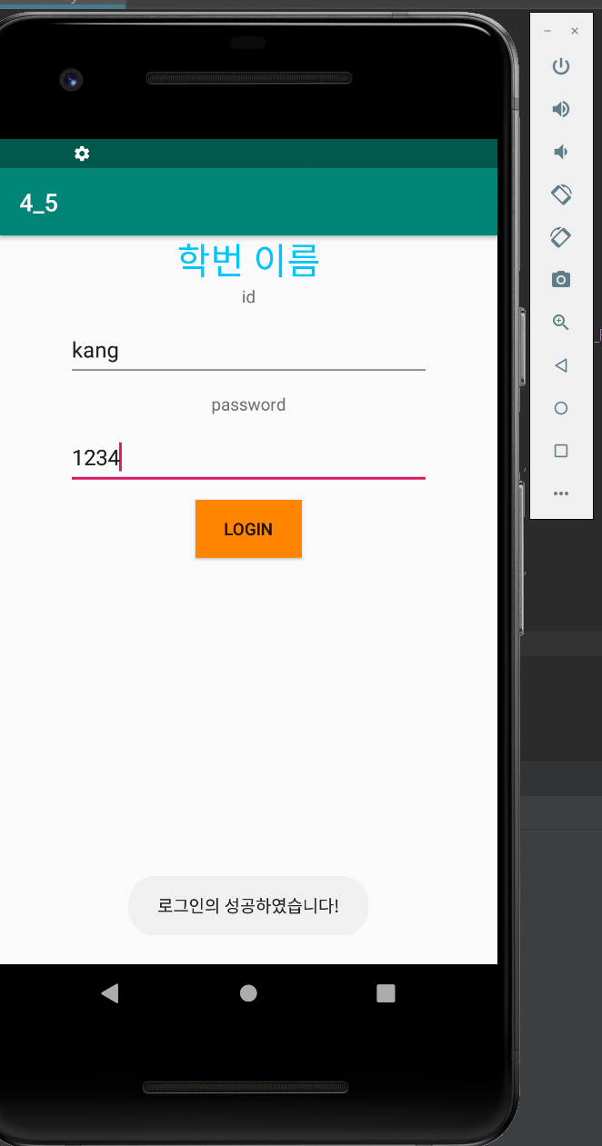 package kr.ac.dongyang.a4_5 import android.app.Activity import androidx.appcompat.app.AppCompatActivity import android.os.Bundle import android.widget.EditText import android.widget.Toast import kotlinx.android.synthetic.main.activity_main.* class MainActivity : AppCompatActivity() { override fun onCreate(savedInstanceState: Bundle?) { super.onCreate(savedInstanceState) setContentView(R.layout.activity_main) BtnLogin.setOnClickListener{ var id = IDInput.text.toString() var pw = PWInput.text.toString() val sharedPreference = getSharedPreferences("file name" , Activity.MODE_PRIVATE) val savedId = sharedPreference.getString("id", "kang") val savedPw = sharedPreference.getString("pw", "1234") if(id == savedId && pw == savedPw) { Toast.makeText(applicationContext,"로그인의 성공하였습니다!", Toast.LENGTH_SHORT).show() } else{ Toast.makeText(applicationContext,"로그인의 실패하였습니다!", Toast.LENGTH_SHORT).show() } } } }실행결과
